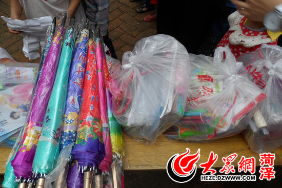 禮物很豐富,包括雨傘、水壺、跳繩、橡皮泥、字帖、水彩筆等