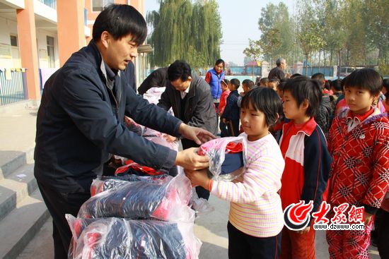 來(lái)自省食品藥品監(jiān)督管理局的“第一書(shū)記”王洪坤向柿園小學(xué)的孩子們送上了校服。記者 張帆 攝
