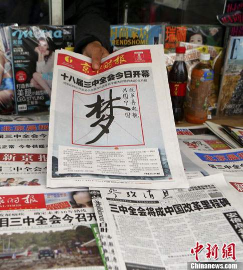 11月9日,北京一個(gè)報(bào)攤上,多家報(bào)紙的頭版都報(bào)道了十八屆三中全會(huì)當(dāng)天開幕這一消息。中新社發(fā) 李慧思 攝