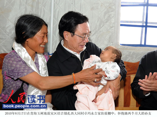 2010年8月17日在青海玉樹地震災區結古鎮扎西大同村卓瑪永吉家防震棚中,懷抱她兩個月大的孫女。