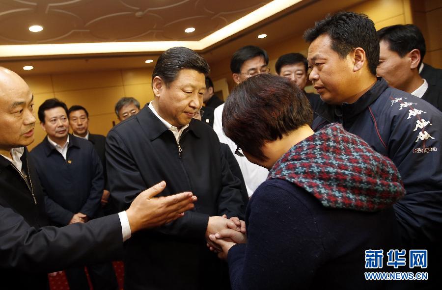 11月24日,中共中央總書記、國家主席、中央軍委主席習(xí)近平來到山東青島,考察黃島經(jīng)濟(jì)開發(fā)區(qū)黃濰輸油管線泄漏引發(fā)爆燃事故搶險工作。這是習(xí)近平看望遇難者家屬。新華社記者 鞠鵬 攝
