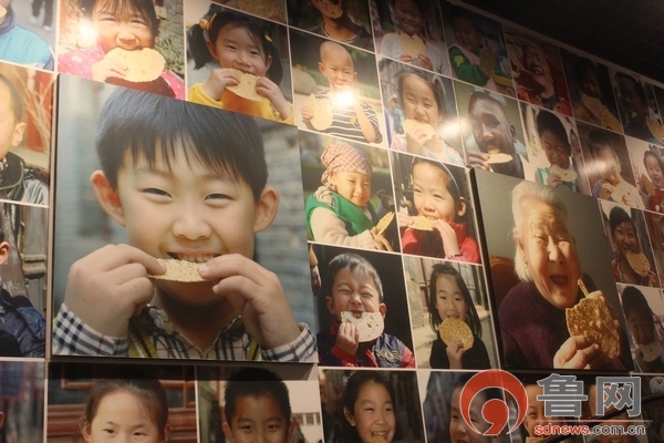 周村燒餅博物館內通往燒餅制作區的電梯兩側,掛滿了百余幅游客吃燒餅的歡樂笑臉。