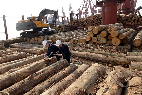 12月13日,在日照港嵐山港區,工作人員對進口原木進行表層查驗。據日照港股份有限公司數據,截至12月12日10時,日照港2013年累計完成貨物吞吐量30017萬噸,首次突破3億噸。新華社發(朱元理 攝)