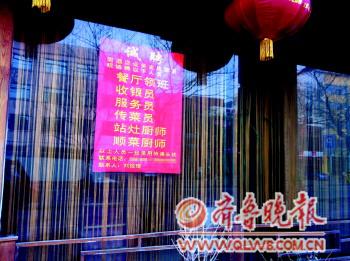 某飯店門前顯眼位置打出了招聘廣告。本報(bào)記者秦昕攝