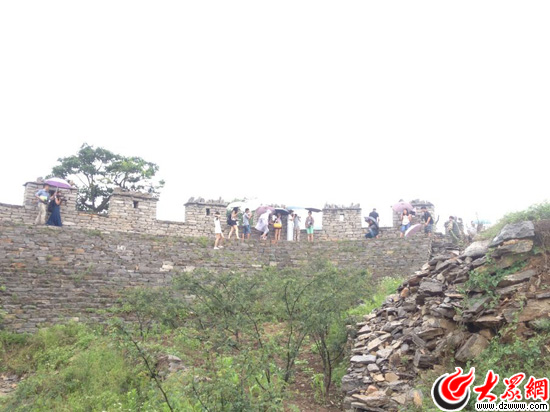南線采訪團記者冒雨爬上齊長城錦陽關段關樓,遠眺中國最古老長城。(大眾網記者 熊戈措 攝)