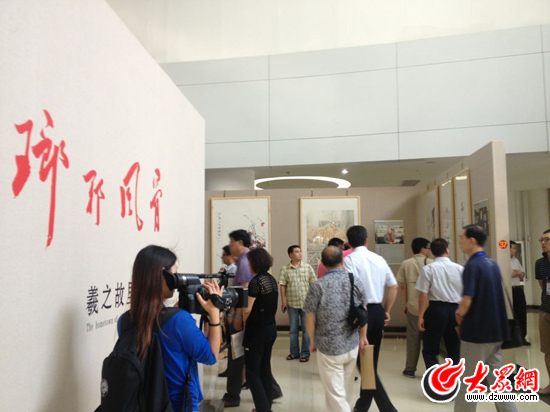 19日,南線媒體行采訪團來到臨沂文化中心。記者們正在參觀王羲之書畫作品。(大眾網記者 李兆輝攝)