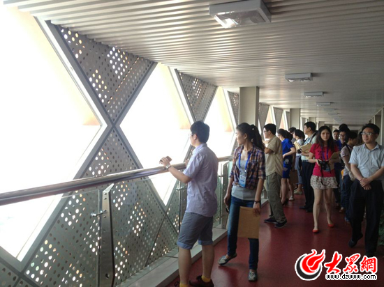19日,”聚焦美麗山東-第九屆中國網絡媒體山東行”南線采訪團來到臨沂文化中心。記者在326米的高樓上俯瞰臨沂建設全貌。(大眾網記者 李兆輝攝)