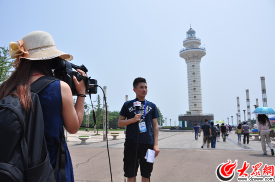 日照燈塔高36.2米,燈光高18海里,高度39.9米,射程18海里,主要功能是為日照近海及進出日照港的船舶提供導航服務。圖為記者在燈塔前采訪。(大眾網記者 熊戈措攝)