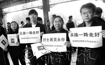 首鋼園區(qū)服務(wù)公司職員舉著自制的悼詞牌,向兩位英雄告別。