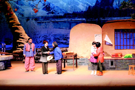 近日在京演出的山東萊蕪梆子現代戲《兒行千里》,劇情并不復雜。高官鄭耀忠攜妻帶女回到山村老家為80歲的老母親祝壽,簡樸的壽宴上不請自到的周總,畢恭畢敬的李主任,賓館里等待接見的地方領導,包裝精美的洋酒、野山參,禮盒里夾著的巨額現金,這些讓敏感的老母親不由得起了疑心。緊接著以“驚夢”、“驚魂”、“驚恐”為名串起的三場戲,是母親的重重驚怕,背后也是兒子無法挽回的步步沉淪與蛻變,權錢交易、利欲熏心的鄭耀忠最終鋃鐺入獄。善良的老母親跪求鄉親,四處籌錢以還贓款。在一場大義、大愛的“驚淚”戲后,鄭耀忠最終因立功表現,從生死線上被拉了回來。