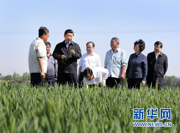 習近平十分關心夏糧形勢。在列車上,他就向隨行的農業部門負責人了解全國夏糧生產情況。到武清站一下列車,他直接來到南蔡村鎮丁家瞿阝村的小麥大田,仔細察看小麥長勢,向農民詢問田間管理和預產情況,叮囑當地干部加強農技服務,搞好田間管理,努力爭取夏糧豐收。他強調,一個國家只有立足糧食基本自給,才能掌握糧食安全主動權,進而才能掌握經濟社會發展這個大局。他希望天津加快發展現代都市型農業,努力提高糧食自給能力,為確保國家糧食安全多作貢獻。