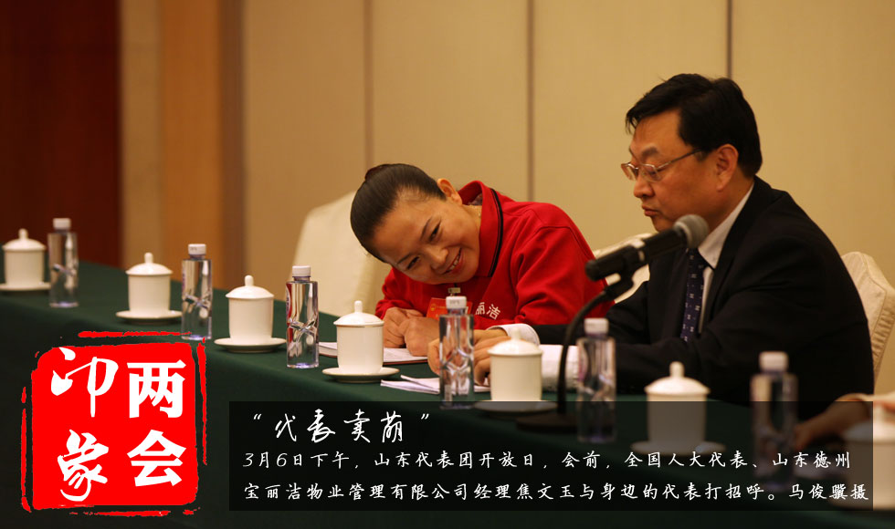 印象兩會·山東代表團全體會:“代表賣萌”--3月6日下午,山東代表團開放日,會前,全國人大代表、山東德州寶麗潔物業管理有限公司經理焦文玉與身邊的代表打招呼。