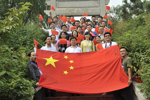 9月23日,兩區一圈看濱州——首屆中國網絡媒體濱州行采訪團在鄒平縣采訪期間,參與采訪的全國各知名網站記者及大眾網濱州站工作人員在櫻花山和國旗合影,為中國點贊。