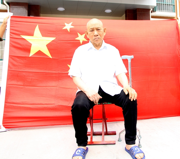 9月24日,濱州市85歲抗美援朝老兵李森林與國旗合影,為中國點贊。