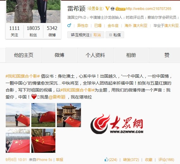 雷希穎:活動是9月6號發起的,當時就是在微博開了一個話題,分享了自己的一些和國旗合影的照片。我到澳大利亞將近4年,微博、微信這些自媒體是我們留學生關注國內時事最便捷的平臺。在我使用微博、微信的過程中,覺得現在的網絡輿情有些問題,在網上正常表達愛國之情反而成了敏感的事,不時地會受到攻擊、辱罵和嘲諷。今年正值建國65周年和抗戰勝利69周年,我想從自身做起,利用這樣的輿論氛圍改變網絡輿論環境,讓大家能夠看到一個更加客觀和全面的中國。