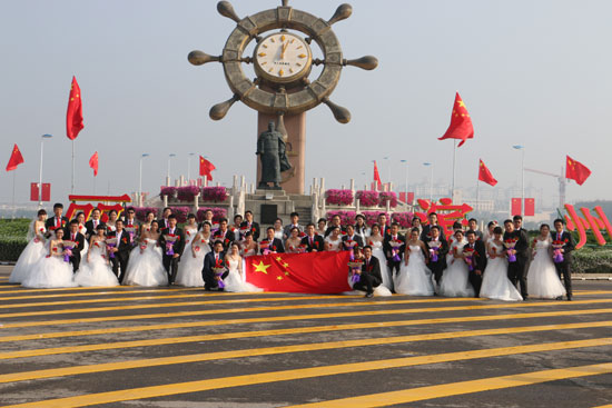9月29日,來自濱城區(qū)的26對新人在中海舵盤下與國旗合影
