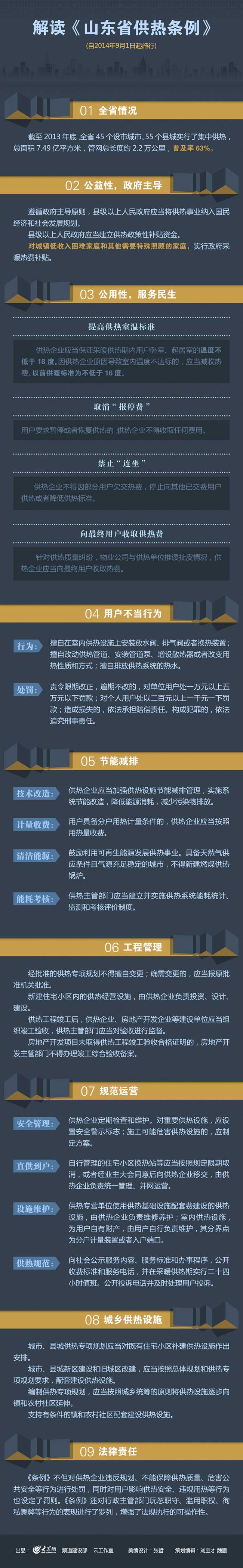 (五)突出規范運營行為,保障供熱安全穩定運行。一是加強供熱安全生產管理!稐l例》規定,發展供熱事業應當遵循保障安全的原則;供熱企業應當對其負責管理的供熱設施進行定期檢查和維護,保證其在使用期內安全穩定運行;供熱企業應當建立健全安全生產責任制。對高溫高壓等重要供熱設施,應當按照規定設置明顯的安全警示標志;建設工程施工可能危害供熱設施安全的,建設單位應當與供熱企業協商制定安全保護施工方案,并采取相應的安全保護措施后方可施工!稐l例》還列出了六種危害供熱設施安全的禁止行為。二是推行供熱運營一體化直供到戶。供熱企業把熱賣給物業等中間機構,再由其轉賣給用戶,這些機構往往缺少專業管理隊伍,供熱質量難以保障,是產生矛盾糾紛的集中節點!稐l例》規定,供熱企業應當實行熱源、管網、換熱站經營管理一體化,物業服務企業等單位自行管理的住宅小區換熱站等供熱經營設施應當按照規定限期取消,或者經業主大會同意后向供熱企業移交,由供熱企業負責統一管理、并網運營。三是確立了供熱經營設施維護責任。與《山東省物業管理條例》相銜接,供熱專營單位使用供熱基礎設施配套費建設的供熱設施,由供熱企業負責維修養護;室內供熱設施,為用戶自有財產,由用戶自行負責維護,其分界點為分戶計量裝置或者入戶端口!稐l例》對此作了相應規定。四是推行供熱規范化服務。《條例》規定,供熱企業應當實行標準化管理和規范化服務,向社會公示服務內容、服務標準和辦事程序,公開收費標準和服務電話,并在采暖供熱期實行二十四小時值班。供熱主管部門應當對供熱企業供熱質量和服務質量進行監督檢查和考核,公開投訴電話、信箱等,并及時處理用戶投訴。