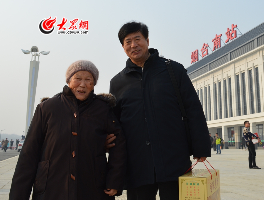 85歲的孫老太,與女婿在煙臺南站的廣場上留念。從青島有“超快”的火車直達煙臺,這一刻她等了半個世紀。(記者 王宗陽 攝)