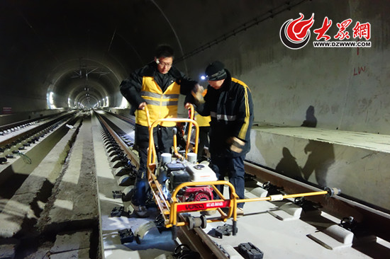 12月份,李魏林的工作地點在蓁山隧道,同樣是進行測距、精調,進入隧道,濃度很高的水泥粉末撲面而來。李魏林說,因為隧道壁還未打磨好,墻壁上的水泥粉末彌漫到隧道里,“一天工作結束后,頭發都變白了。”一進入工作區域,李魏林便笑容收斂,推起軌檢儀開始了嚴謹的工作,“這里需要減0.5毫米,這個加0.8毫米”,隨后,李魏林熟練地擰下螺釘,更換扣件、墊板,使得誤差精確在1毫米之內。