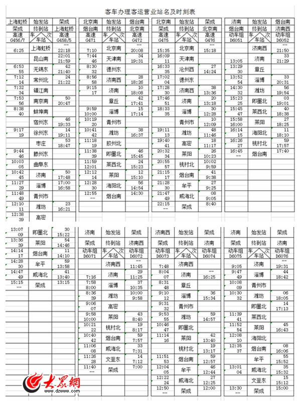 。ㄈ╅_行方案:G458/5次由榮成自2014年12月28日起開行,G456/7次由上海虹橋、D6073次由濟南西、D6078次由榮成均自2014年12月29日起開行。