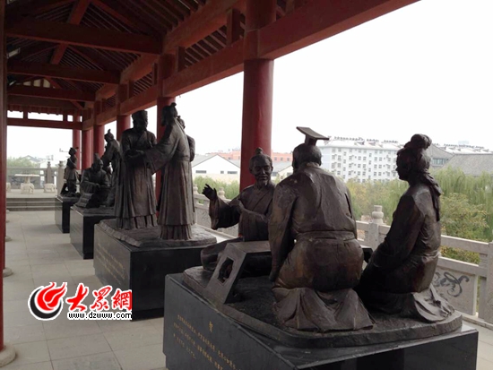 董子文化街位于德州市經(jīng)濟開發(fā)區(qū),雙層的仿古建筑檐牙交錯,園區(qū)設(shè)計可謂曲徑通幽,穿過一條條書法、文物、雕刻的交易長廊后,一片清澈的湖水出現(xiàn)在記者面前。湖岸聳立著一座由當代著名雕塑大師錢紹武銅鑄的董仲舒雕像。雕像背后是董子讀書臺,拾階而上,猶如走進大漢殿堂,氣勢恢宏,盡顯大漢雄風。