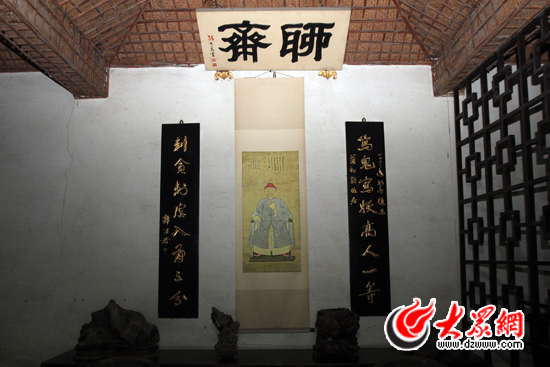 22日上午,記者一行人走進這座具有典型北方農家院落風格的故居,一進正門,三棵古槐盤根錯節聳立路邊,好像在訴說著蒲松齡的蒼桑,也記載著蒲家莊的變遷。門楣上懸掛著郭沫若題寫的匾額:“蒲松齡故居”。院內有瓦舍茅屋,花叢瓜架,既有書屋情趣,又還有農舍野味。書房“聊齋”內,高懸著蒲松齡研究專家路大荒手書的“聊齋”匾額,匾下是蒲松齡74歲時身著公服、手捻銀須的畫像。