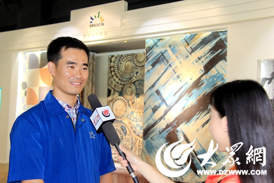 東升地毯集團(tuán)訂單管理指揮中心主任王仕章向記者介紹本次閱兵式紅毯的制作過程(大眾網(wǎng)記者 張麗 攝)