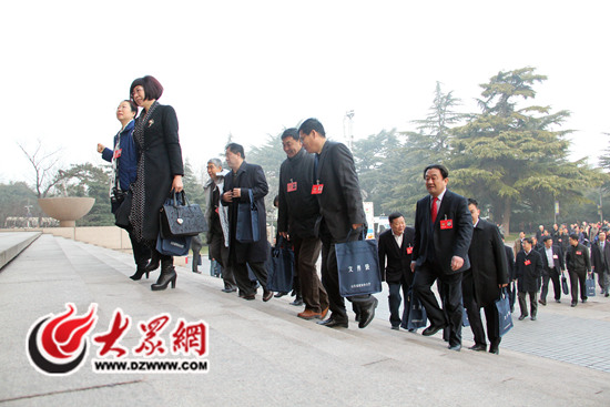 今天上午8:30左右,參加山東省政協十一屆三次會議開幕會議的政協委員開始入場,圖為政協委員們走進山東會堂。記者 馬俊驥 攝。
