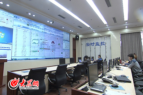山東省環(huán)保廳17樓的監(jiān)控室實(shí)時(shí)監(jiān)控山東各地的污染情況。