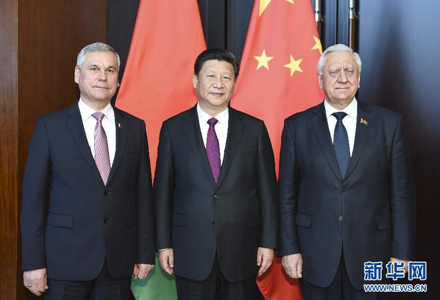 5月11日,國家主席習近平在明斯克會見白俄羅斯國民會議共和國院主席米亞斯尼科維奇(右)和代表院主席安德烈琴科(左)。新華社記者謝環(huán)馳 攝