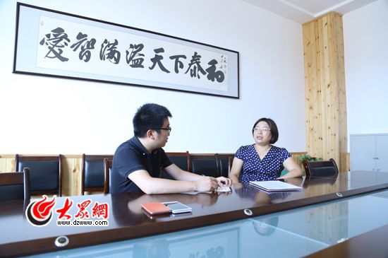 “支教島”校長聯(lián)盟成員、青島天泰城學(xué)校校長王建娥(右)向大眾網(wǎng)記者講述她與“支教島”的不解之緣。(亓翔 攝)