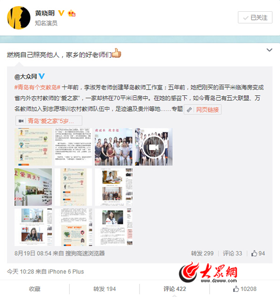 大眾網濟南9月6日訊(記者 劉明明)近期,大眾網刊發的“青島有個支教島”系列報道影響力不斷擴大,引發全國網友的廣泛關注。6日上午10點半,青島籍知名演員黃曉明在微博上轉發“支教島”的相關微博,為“支教島”點贊。他在微博中說:“燃燒自己照亮他人,家鄉的好老師們。”