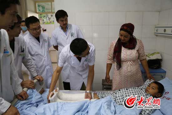 在疏勒縣人民醫(yī)院,只有10歲的孩子圖拉普·阿西木在8個月大的時候被查出患有腦癱。父母親帶著他四處尋醫(yī),大多被建議保守康復(fù)治療。經(jīng)過了幾年的治療后,圖拉普·阿西木在6歲時才可以走路。圖拉普·阿西木的母親米日古麗·阿卜力米提聽大隊的宣傳人員說山東的醫(yī)療專家來疏勒免費(fèi)為腦癱患者進(jìn)行手術(shù),一大早就帶著孩子來看病。經(jīng)過近兩個小時的治療后手術(shù)成功。在病房里,圖拉普·阿西木對著記者的鏡頭舉起小手比劃著“V”字,父母親連連豎起大拇指稱贊山東的醫(yī)療專家。