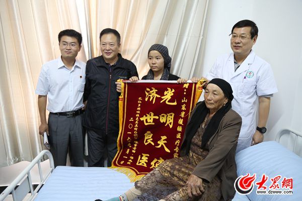 疏勒縣老人塔吉姑閃·洪如孜的家人為山東大學(xué)第二醫(yī)院眼科主任張晗獻(xiàn)上錦旗。