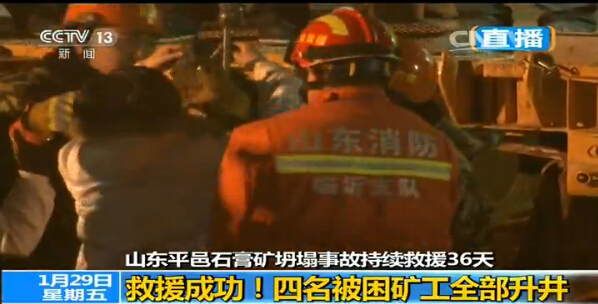 1月29日22點49分,隨著第4名被困礦工安全到達地面,被困在5號救生孔附近巷道里的4名礦工全部順利升井!截止到目前,此次事故共有15名井下被困礦工獲救,另外有1人已確認遇難,13人仍失聯。(央視)