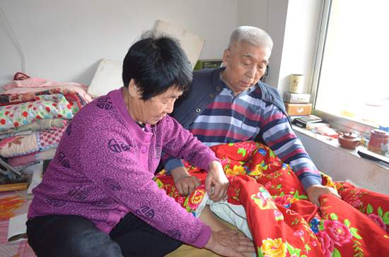 從那以后,王業(yè)秀傾其全力照顧丈夫,家里的積蓄全部花上了,生活已經(jīng)捉襟見肘,連治療費用都只能跟親戚朋友借。就算這樣,她仍然省吃儉用,想盡辦法給丈夫加營養(yǎng),平常哪怕有一口好吃的也是留給丈夫吃。同時,在照顧丈夫的生活起居上,王業(yè)秀更是付出了巨大艱辛。“剛出這事的時候,他老是想不開,想過自殺,所以晚上俺都不敢睡沉,就怕他出事。”王業(yè)秀說。丈夫癱瘓后的40年來,王業(yè)秀沒有睡過一個安穩(wěn)覺,除了擔(dān)心丈夫,她每晚還至少要起來兩三次,一邊幫丈夫翻身,一邊檢查丈夫大小便情況,“每天要幫他翻幾次身,擦洗、換尿布,換洗不及時很容易生褥瘡。”王業(yè)秀說,而每次給丈夫翻身,都要費盡她全身力氣,一遍下來,王業(yè)秀經(jīng)常累得氣喘吁吁。不僅如此,每天王業(yè)秀一早就要起床收拾屋子,再給丈夫翻一次身、擦一遍身體,還要為丈夫做早飯。平時她還堅持為丈夫按摩,多年下來,王業(yè)秀已經(jīng)掌握了許多按摩技巧,手法比專業(yè)按摩師一點也不差。天氣暖和的時候,她就推著丈夫出去溜達,和鄰居聊天,陪丈夫解悶。這種日子,她一過就是40年,40年的堅守和照顧,王業(yè)秀從無怨言、從不后悔。在她的悉心照料下,丈夫也逐漸從陰影里走出來,病情也趨于穩(wěn)定。