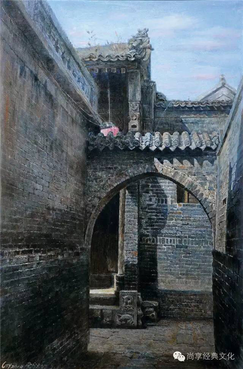 古代建筑,經(jīng)過(guò)流光歲月的洗禮,留下的,是斑駁,是滄桑。舊街古巷的暗色調(diào),予人靜謐與踏實(shí),就像一位飽經(jīng)滄桑的老者,欲將滿腹的故事說(shuō)與你聽(tīng)。逝去的風(fēng)云滌蕩,輝煌惆悵,歷歲月沉積,洗盡鉛華后,惟余干凈與淳樸,莊嚴(yán)與厚重。古建筑的紅墻、灰瓦,青石,朽門,渾厚而澄靜,悠遠(yuǎn)而低調(diào)。無(wú)窮韻味,就深藏于一磚一瓦,一草一木,一庭一巷之中。它們那斑駁陸離的光色、古韻悠長(zhǎng)的構(gòu)造、拙樸漬實(shí)的質(zhì)感與朦朧恢宏的意境,借助繪畫(huà)語(yǔ)言客觀地真摯呈現(xiàn),來(lái)喚醒世人塵封的記憶、聆聽(tīng)久遠(yuǎn)時(shí)光的追索,敬畏歷史,珍惜現(xiàn)世。
