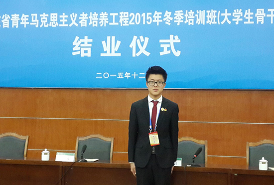 2015年12月,孫濤作為濰坊學(xué)院選拔出來的唯一學(xué)生骨干代表參加了由共青團(tuán)山東省委和山東省學(xué)生聯(lián)合會共同主辦的山東省青年馬克思主義者培養(yǎng)工程2015年冬季培訓(xùn)班。在最后的學(xué)習(xí)總結(jié)中,孫濤這樣寫道:“這次培訓(xùn),在我的心中埋藏下了一顆深深的種子,在今后的學(xué)習(xí)工作生活中,定將牢記自己肩上所肩負(fù)的責(zé)任和使命,以實(shí)際行動助推青春中國夢,為實(shí)現(xiàn)中華民族偉大復(fù)興的中國夢和‘兩個一百年’奮斗目標(biāo)貢獻(xiàn)當(dāng)代大學(xué)生的青春和力量!”