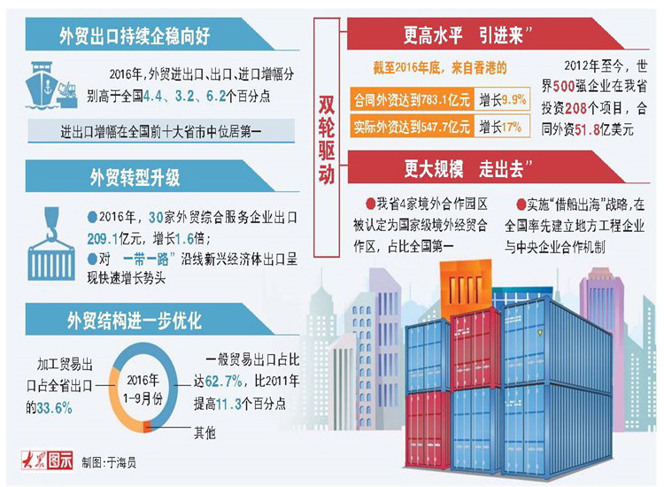 外貿新業態等新發展動能的積聚,帶動對外貿易結構進一步優化,2016年1-9月份加工貿易出口占全省出口的33.6%,一般貿易出口占比達到62.7%,比2011年提高了11.3個百分點。