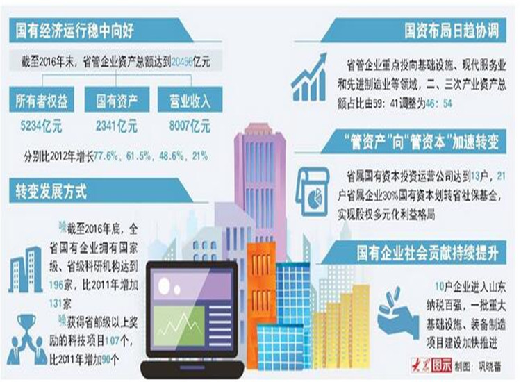 在山東,國(guó)企改革是事關(guān)發(fā)展全局的大文章。上世紀(jì)90年代領(lǐng)國(guó)有中小企業(yè)改革風(fēng)氣之先的山東,在新一輪國(guó)企改革中再次“勇于擔(dān)當(dāng)”:組建國(guó)有資本投資運(yùn)營(yíng)公司、完善公司治理結(jié)構(gòu)、經(jīng)營(yíng)性國(guó)有資產(chǎn)統(tǒng)一監(jiān)管……一系列精準(zhǔn)化改革推動(dòng)山東國(guó)有資本布局結(jié)構(gòu)加速優(yōu)化調(diào)整。截至2016年末,省管企業(yè)資產(chǎn)總額達(dá)到20456億元,所有者權(quán)益5234億元,國(guó)有資產(chǎn)2341億元,營(yíng)業(yè)收入8007億元,分別比2012年增長(zhǎng)77.6%、61.5%、48.6%、21%。