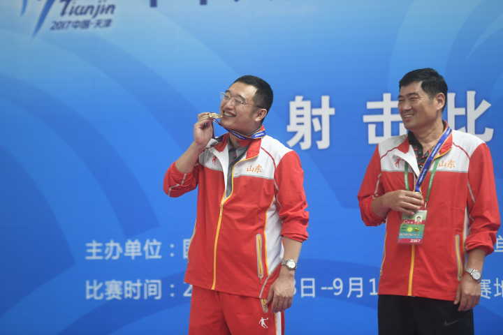 8月30日,第十三屆天津全運(yùn)會(huì)射擊比賽在天津團(tuán)泊體育中心射擊館繼續(xù)進(jìn)行,男子10米氣手槍,七朝元老山東老將譚宗亮以242.3環(huán)奪得金牌,山西選手王智偉以240.1環(huán)獲得銀牌,銅牌被新疆選手王哲昊奪走。(大眾網(wǎng)特派記者 王長坤 攝)