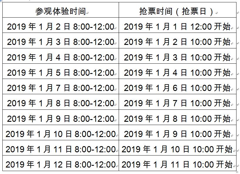 2019年1月2日——2019年3月底,每周一到周六上午(8:00-12:00)開放參觀體驗。