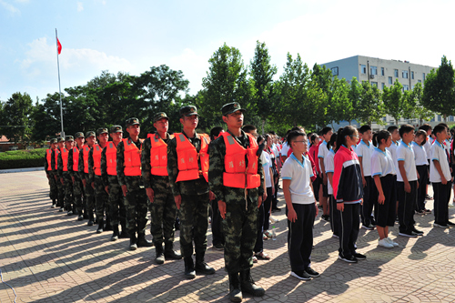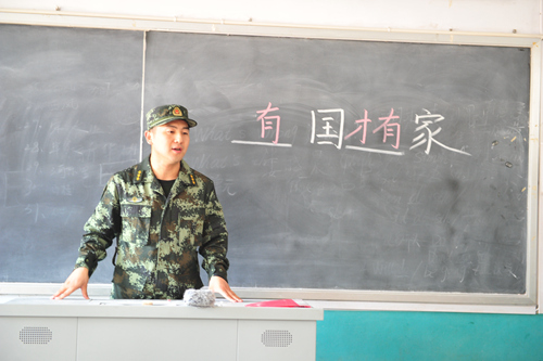 壽光市田馬中學屬于受災較嚴重的學校,三面圍墻倒塌,學校大部分課桌椅及學習用品被泡。山東武警總隊濰坊支隊見到大眾網新聞報道之后,立即開展救援,在開學前夕將300套嶄新的課桌椅送到學校。濰坊武警干事王俊男給學生們提前上了開學第一課——“有國才有家”。
