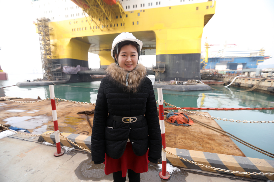 采訪團記者在拍攝中集來福士的Beacon Atlantic鉆井平臺,拍攝姿勢非常“萌”。