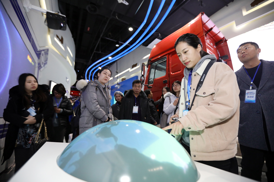 采訪團記者對中國重汽展廳內的觸摸球“愛不釋手”。