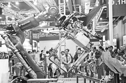 □CFP供圖 2017年11月7日,上海,第十九屆中國國際工業博覽會現場,觀眾在YASKAWA機器人的展位參觀。
