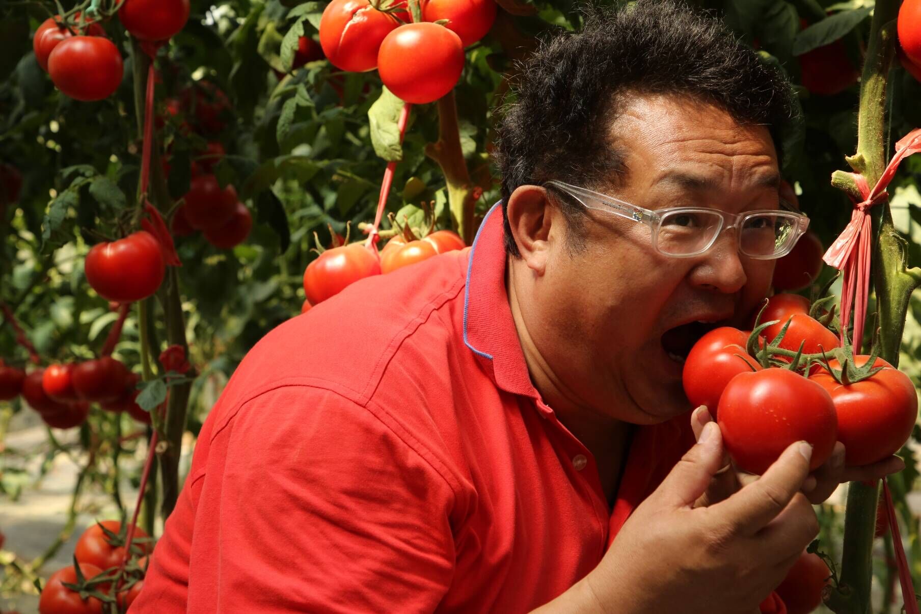 在菜博會展館里,網絡名人黃勝友與西紅柿合影