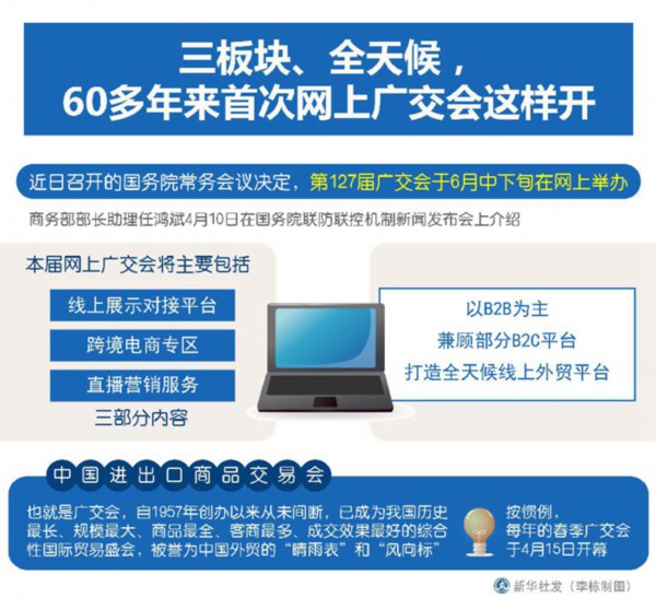 近日召開的國務院常務會議決定,第127屆廣交會于6月中下旬在網上舉辦。本屆網上廣交會將為參展企業和采購商提供網上推介、供采對接、在線洽談等服務,讓中外客商足不出戶下訂單、做生意。 [詳細]