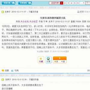 德州城管支隊(duì)在德州一中學(xué)生上課之際,將學(xué)生停放在校外的自行車收走,并罰款50元的做法被大眾網(wǎng)網(wǎng)友發(fā)帖曝光,經(jīng)大眾網(wǎng)報(bào)道后,引起網(wǎng)友強(qiáng)烈反響,眾多網(wǎng)友發(fā)帖認(rèn)為德州城管的行為違背了人性化執(zhí)法的理念,更有網(wǎng)友認(rèn)為這是野蠻執(zhí)法。 截至7日上午11點(diǎn),大眾網(wǎng)德州論壇“生財(cái)有道的德州城管大隊(duì)”一貼點(diǎn)擊量已經(jīng)超過(guò)8萬(wàn)5千,網(wǎng)友回帖評(píng)論達(dá)到140條。絕大部分網(wǎng)友對(duì)城管扣中學(xué)生自行車并罰款的行為表達(dá)了不滿。 ... ...