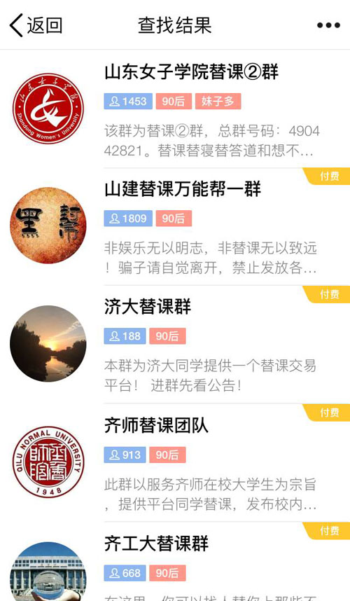在QQ上以“替課”為關鍵詞搜索QQ群,全國各地的高校替課群有二百多個,僅駐濟高校替課群就近20個,這些替課群少的有數百人,多的上千人,其中14個群甚至還設置為付費群,必須繳納1-2元不等的費用才能進入該替課群。